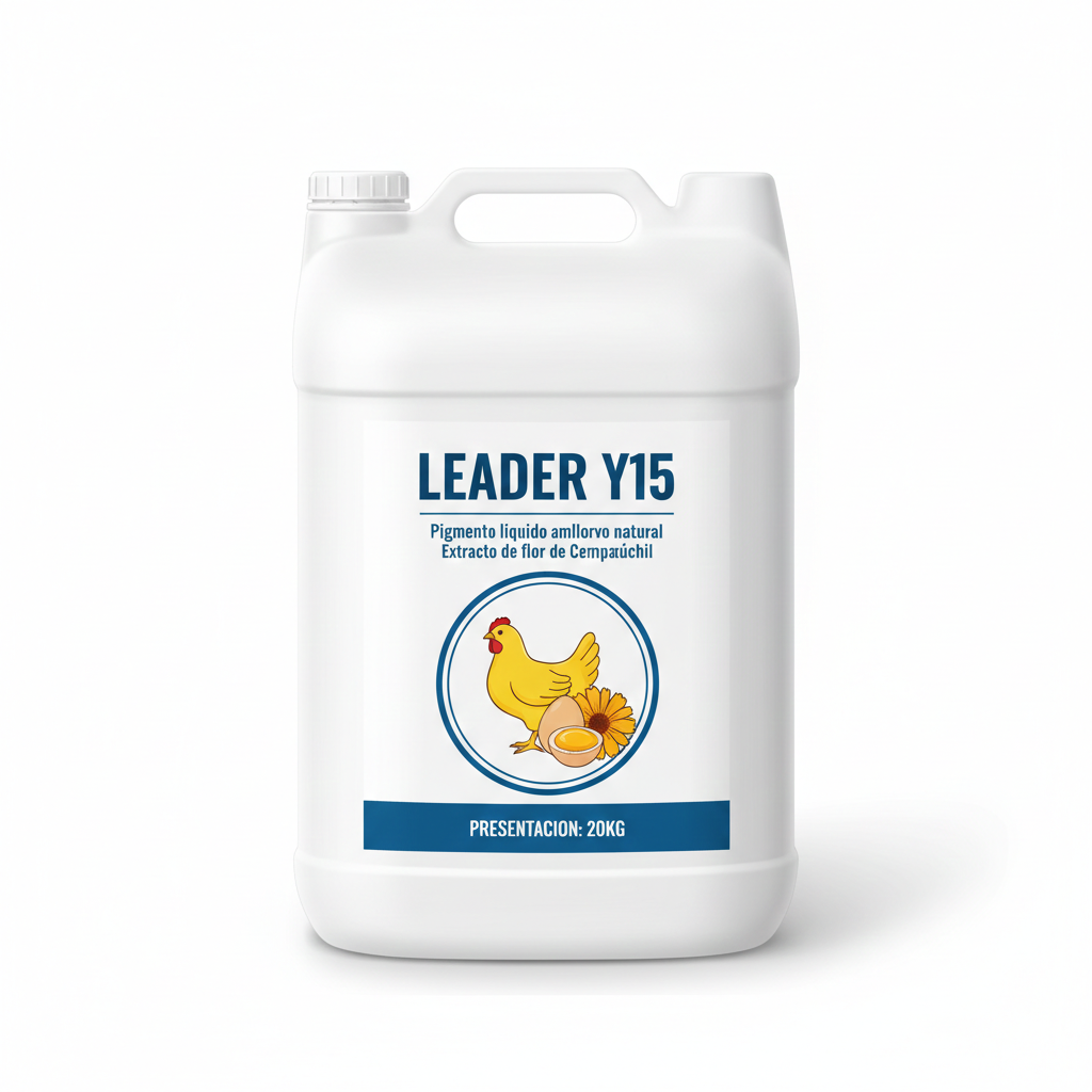 LEADER Y15 es un pigmento líquido estabilizado de xantofilas derivadas de flor de cempasúchil (Tagetes erecta), con alto contenido de luteína biodisponible. Ideal como complemento en dietas con bajo aporte de pigmentos, asegura uniformidad en piel y yema, mejorando la presentación final del producto.