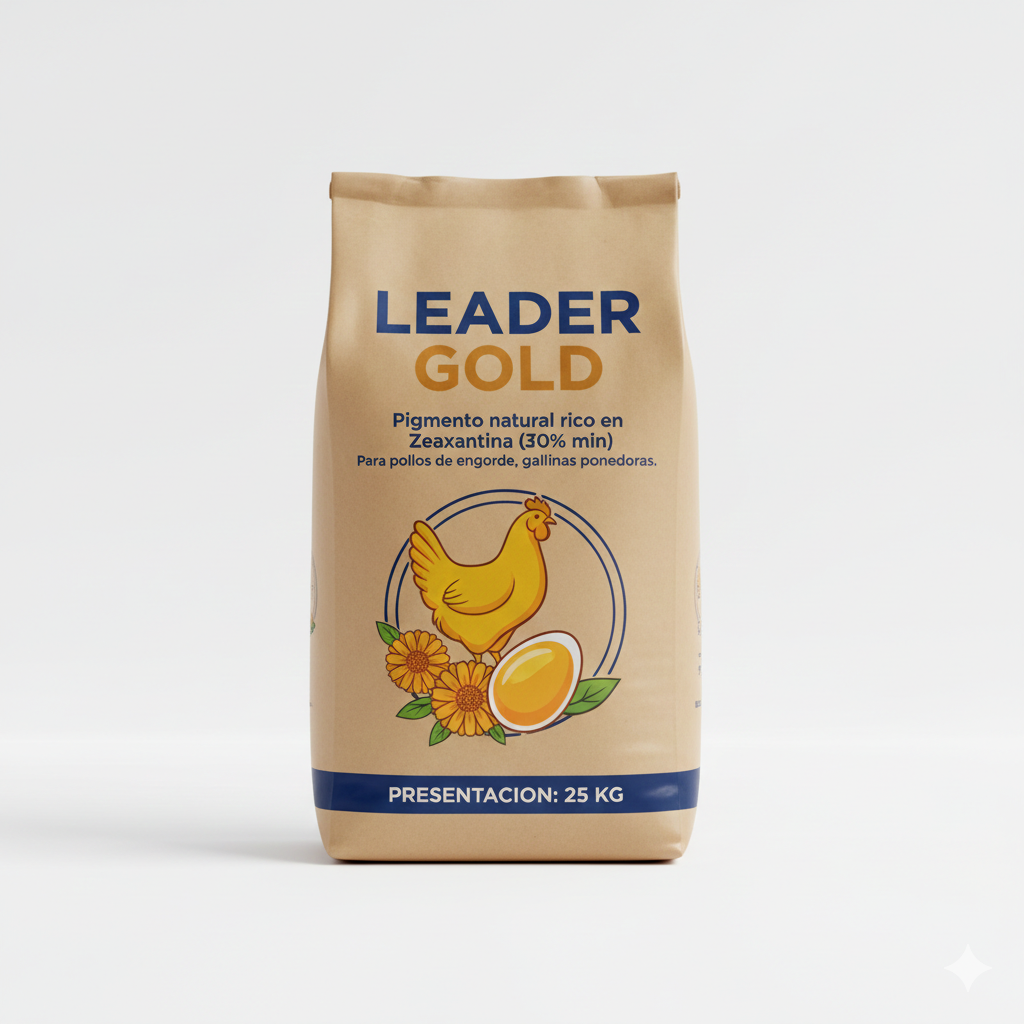 LEADER GOLD 20 es un pigmento natural rico en zeaxantina (30% mín.), derivado del extracto de caléndula (Tagetes erecta). Formulado para pollos de engorde y gallinas ponedoras, mejora la intensidad y uniformidad del color en piel y yema. Su alta biodisponibilidad garantiza mayor eficiencia y mejores resultados en pigmentación avícola.