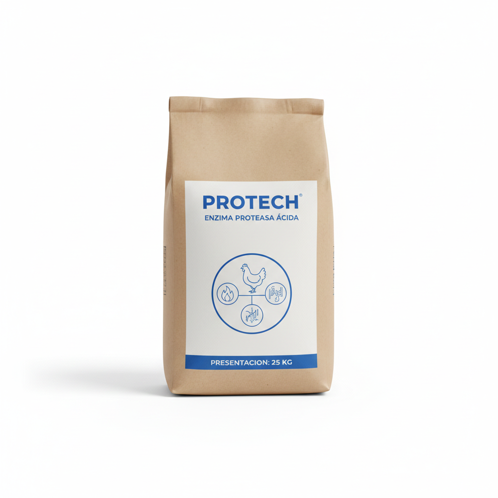 Enzima proteasa ácida desarrollada para optimizar la digestión de proteínas en aves y cerdos. Producida por fermentación líquida, ofrece excelente estabilidad térmica en procesos de peletizado, mejorando el aprovechamiento nutricional.