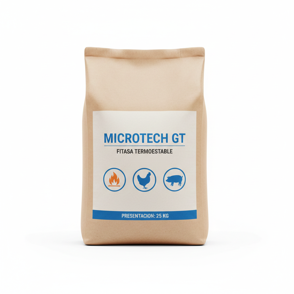 Fitasa termoestable producida por fermentación líquida. Diseñada para aves y cerdos, mejora la digestibilidad del fósforo y nutrientes en alimentos peletizados. Alta estabilidad al calor y mayor eficiencia nutricional.